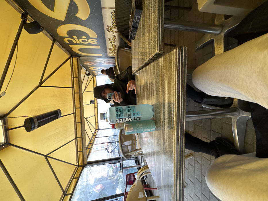 The scene depicts an enclosed outdoor cafe seating area, identified by the "Nice" brand logo and "Follow the Flavors" tagline on a dark background wall, located in Sofia, Bulgaria. The area is covered by a yellow, multi-faceted canopy structure from which an overhead, cylindrical electric heater is suspended. In the mid-ground, a person wearing a dark hooded jacket is seated at a table, focusing on a light-colored smartphone held in both hands. Their right hand is displaying a gesture resembling a 'rock on' or 'devil horns' sign. On the dark gray and white striped tabletop directly in front of this individual are a 750ml light-blue plastic bottle of "DrWitt Vitamin Water" and a light-blue "Red Bull Ice Edition" aluminum can. A black ashtray with "DUNHILL" branding is visible on an adjacent table section to the right. A second individual, partially obscured, is seated further back within the cafe's confines. In the immediate foreground, beneath the table, the lower extremities of a person wearing light-gray sweatpants and dark footwear are visible, indicating the perspective of the photographer. The exterior environment, visible through clear plastic sheeting, appears to be a blurred urban street scene.