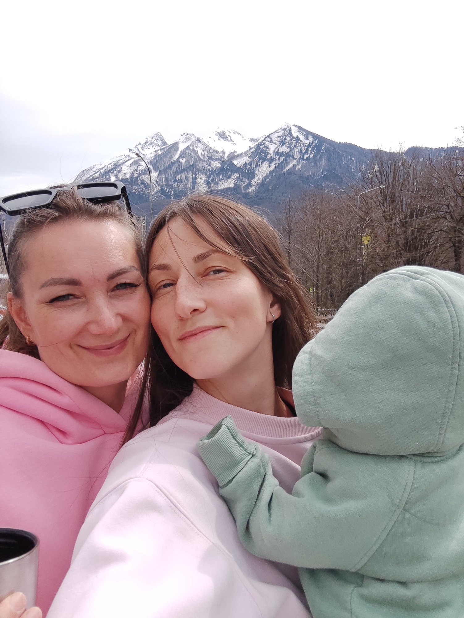 Two women, one wearing a pink hoodie with sunglasses perched on her head and the other in a light pink sweatshirt, pose for a selfie. A baby wearing a light green hooded jacket is visible on the right. In the background, snow-capped mountains rise above trees, some bare and some with green foliage. This image was taken in Krasnaya Polyana, Russia.