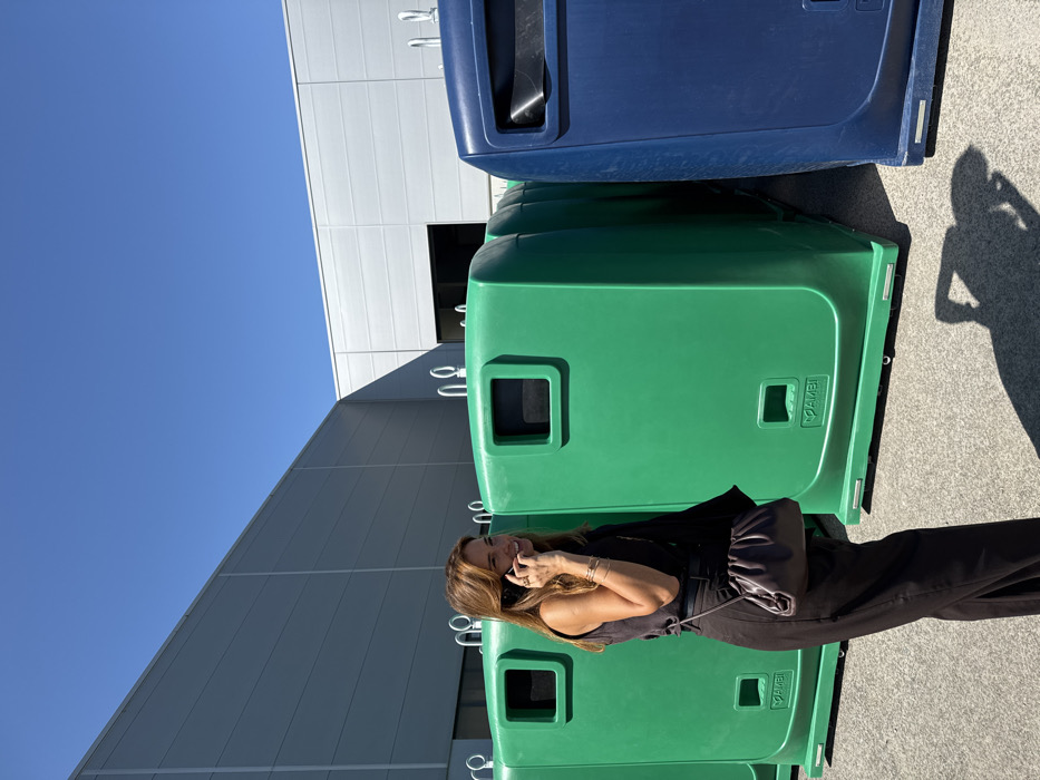 The image captures an outdoor scene in Torres Vedras, Portugal, under a clear blue sky. A woman with light brown hair, wearing a dark sleeveless top, dark wide-leg trousers, and a dark brown gathered handbag, stands on a light gray paved surface. She holds a black smartphone to her right ear with her right hand, indicating she is on a call, and displays a smiling expression. Multiple bracelets adorn her right wrist. Her shadow is cast prominently on the ground to her right. Behind her is a row of large, rectangular recycling containers with rounded tops. At least four green bins are visible, each equipped with a square deposit opening and the "AMBI" logo embossed near the base. A blue recycling bin, also with a rectangular opening, is partially visible on the far right. In the background, two modern industrial or commercial buildings with light gray panel siding are visible. The building on the right features a dark, recessed entrance, and white, loop-shaped fixtures are present along the tops of both structures.