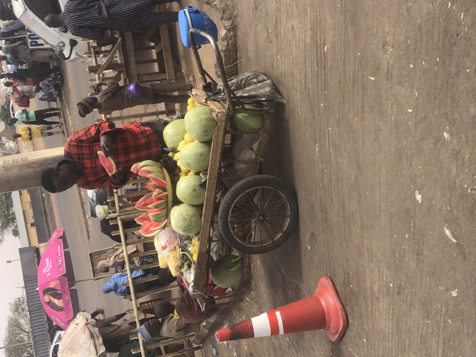 The image depicts a bustling street scene in the city of Tukur Tukur, Nigeria. In the immediate foreground, a red and white traffic cone stands on a paved, dusty surface. Centrally, a male street vendor, wearing a red and black plaid shirt, stands behind a two-wheeled pushcart laden with fruit. He holds a slice of watermelon in his hands, appearing to prepare or inspect it. The cart displays numerous whole, light green watermelons, alongside a large bowl filled with symmetrically arranged slices of red watermelon. Piles of yellow fruit, likely lemons or small oranges, are also visible on the cart, with other produce in bags. A blue cooler is attached to the right handle of the cart. To the vendor's left, two individuals are seated behind a wooden barrier; one is an older male in a light-colored cap. Behind them, a pink umbrella with "LUSH" branding provides shade. To the vendor's right, a young person in a brown outfit and dark knit cap stands, holding an object near their mouth, with a purple pouch attached to their waist. Another male in a striped garment stands partially visible. The background reveals a busy street with numerous pedestrians, some standing, some seated, suggesting a market environment. Vehicles, including a white car with partial "PO" lettering (possibly indicating "POLICE"), are present on the road. Utility poles and various structures are visible under a hazy sky, consistent with a dusty urban setting.