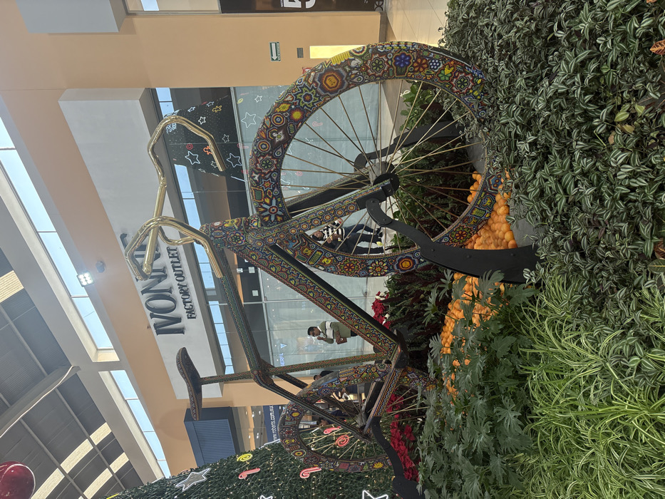 An ornate bicycle sculpture is decorated with colorful beadwork on the frame and wheels, seemingly emerging from a lush garden display with various green plants, red poinsettias, and orange spheres. The backdrop reveals an interior shopping mall environment with a store sign reading "MONTON FACTORY OUTLET." Light from above illuminates the scene.