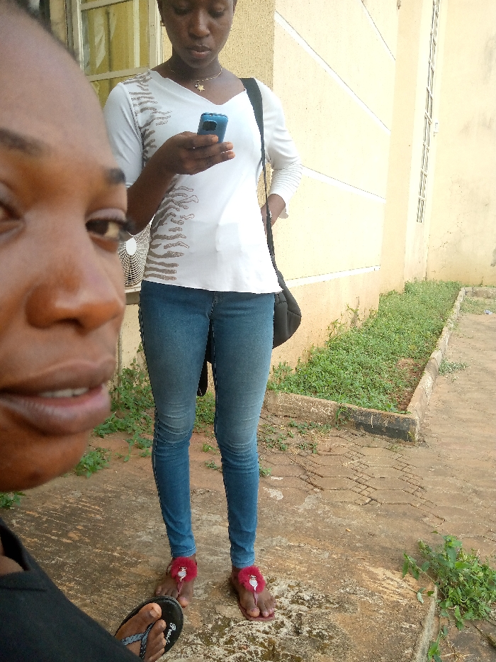 The image depicts two individuals outdoors in Nsugbe, Nigeria. The foreground shows the right profile of a dark-skinned individual, with the right eye looking towards the right and the mouth slightly open. A black thong sandal is visible on the left foot, marked "Bronz." Standing behind and to the right of the foreground subject is a second dark-skinned individual, fully visible from head to ankle. This individual wears a white, long-sleeved shirt with a light-colored abstract pattern, blue denim skinny jeans, and red, fluffy open-toed sandals with a white decorative element. A black shoulder bag hangs on the left side, and a golden star-shaped pendant is visible around the neck. This individual holds a blue mobile phone in both hands, actively viewing its screen. The background consists of a cream-colored building wall featuring horizontal striations and a vertically barred window or vent on the right side. A white electric fan is partially visible behind the second individual, near the building wall. The ground is paved with reddish-brown interlocking blocks or concrete pavers. A raised concrete planter box, containing green vegetation, runs parallel to the building wall, separating it from the paved area. No direct interaction is observed between the two individuals.