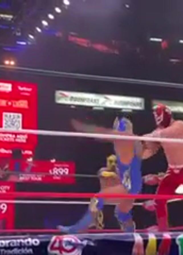 wrestling match in a ring. Two wrestlers, one in blue and one in red, are the focus. The wrestler in red executes a flipping move on the wrestler in blue, knocking them to the mat. A referee in a striped shirt is present. Another wrestler in a yellow mask is visible behind the referee. The ring is surrounded by ropes, and advertisements are displayed around the arena. There's a crowd present, although they are not clearly visible.