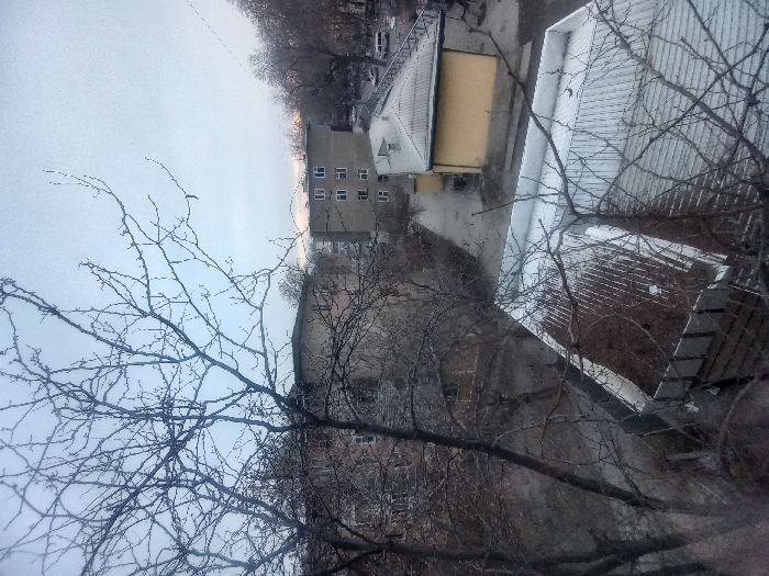 The image presents an elevated, wide-angle view of a residential area in Fergana City, Uzbekistan, under an overcast sky. The foreground is dominated by a dense network of bare, dark tree branches with fine twigs, indicating a deciduous tree in a dormant state. Below the tree branches, two prominent corrugated metal roofs are visible; the left roof features a significant patch of dark soil or debris, while the right roof appears largely clean and reflective white. In the midground, multiple multi-story residential buildings are visible. A light-colored building with dark windows is partially obscured by the foreground trees on the left. Towards the center, a four-story, grey concrete apartment building with uniformly spaced rectangular windows is prominent. To its right, a single-story structure with yellow exterior walls and a dark corrugated roof stands adjacent to a paved pathway that curves through the scene. The background shows additional residential buildings and numerous bare trees lining what appears to be a street or park area. On the far right, several parked passenger vehicles are visible on a street. The overall environment is characterized by a muted, desaturated color palette consistent with an overcast winter or early spring day. There are no individuals discernible within the frame.