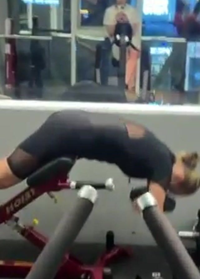 woman in a black workout outfit performing hyperextensions on a red weight machine in a gym. Her legs are secured in the footrests, and she is bent over the pad with her hands on the handles. The camera is positioned behind her, looking slightly upward. In the background, other gym-goers are visible, including a woman in a white shirt taking a selfie in the mirror. The gym has large windows showing the outdoors at night. The lighting is bright, and the atmosphere seems typical of a modern fitness center. The video captures the woman's workout routine and the general gym environment.
