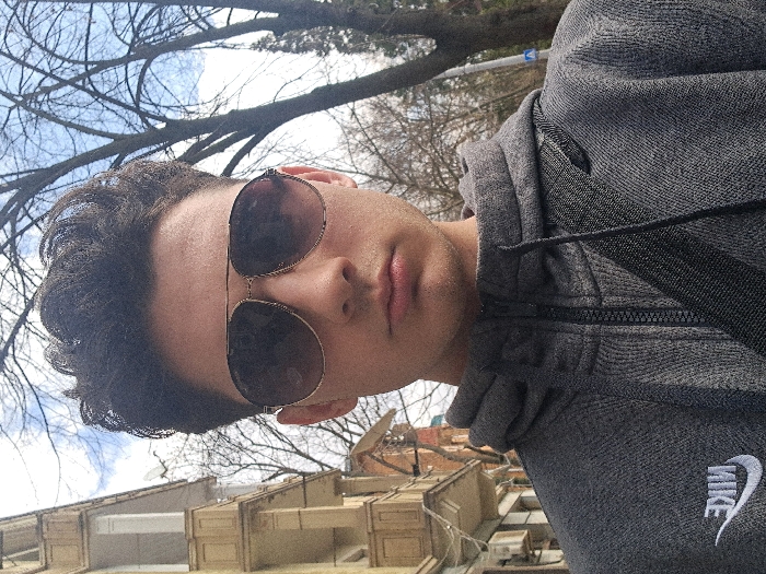 A close-up, selfie-style portrait depicts a young male individual outdoors in Pernik, Bulgaria