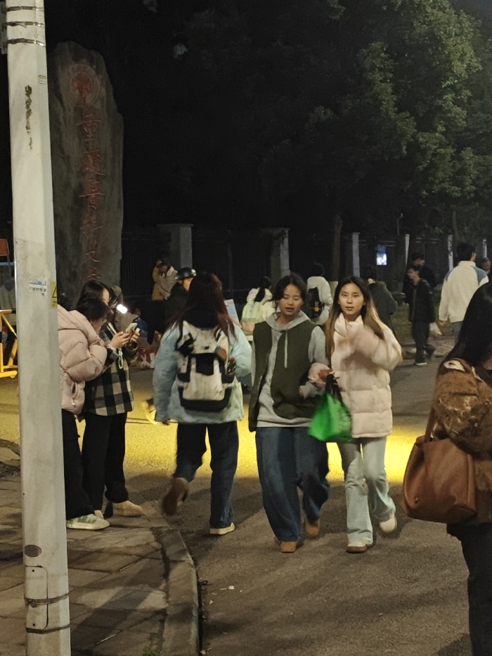 The scene depicts a nighttime urban environment, likely a university campus in Shapingba District, Chongqing, China. A large, dark stone monument bearing red engraved Chinese characters, prominently featuring "重庆大学" (Chongqing University), is visible on the left side of the frame, partially obscured by a light-colored utility pole. Multiple individuals, predominantly young adults, are present on a paved surface, illuminated by artificial lighting that casts yellowish glows. In the mid-ground, two young women walk side-by-side towards the right; one wears a green vest over a light top and blue jeans, while the other wears a light pink puffy jacket, light jeans, and carries a bright green shopping bag in her left hand, with her right arm possibly linked with her companion's. Behind them, another person walks away from the camera, wearing a light blue puffy jacket and a white and black backpack. To the left, a group of people stands near the utility pole; one individual in a plaid shirt is focused on a smartphone, illuminated by its screen. The lower portion of a person with a brown handbag is visible on the far right. In the background, numerous other individuals are discernible, along with dark foliage from trees and what appears to be a wall or fence line. The ground is a dark paved surface with a raised curb along its left edge.