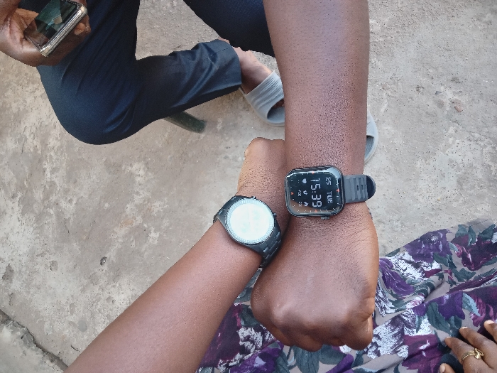 Two people are photographed from above, their arms side-by-side, each wearing a wristwatch. The watch on the right has a black square face displaying "15:39," while the watch on the left has a round face. The person on the right is wearing a floral-patterned garment. One person is holding a smartphone in their left hand. Both are casually dressed in dark pants and sandals. The background is a neutral-toned concrete surface.