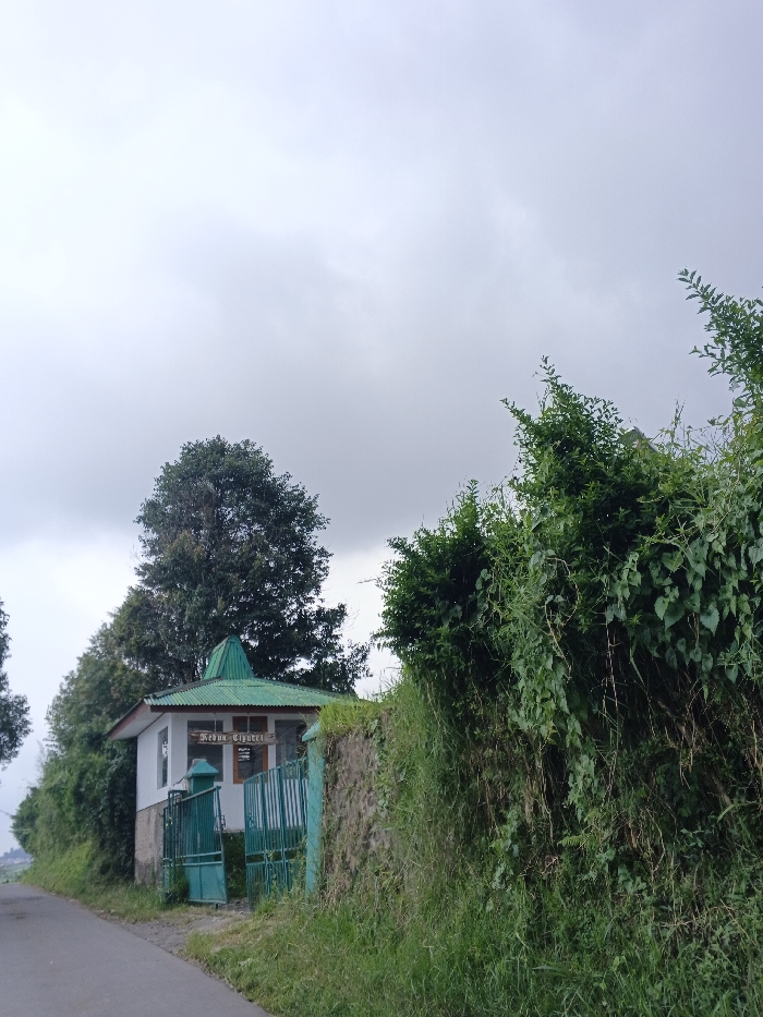 The image captures a small, single-story building located in Uato Carabar, Timor-Leste, situated next to an asphalt road under an overcast sky. The building features white painted walls on its upper section, a natural stone or concrete base, and a multi-faceted green corrugated metal roof. A wooden sign with the inscription "KEBUN CENGKEH" is mounted above a window displaying horizontal wooden panels. An open, green metal gate, composed of vertical bars and a solid lower panel, provides entry to the property from the road. To the right of the gate, a stone wall, heavily overgrown with vines and tall grass, extends into the foreground. Dense green vegetation, including tall trees and bushes, surrounds the building and lines the road. No individuals are present in the scene.