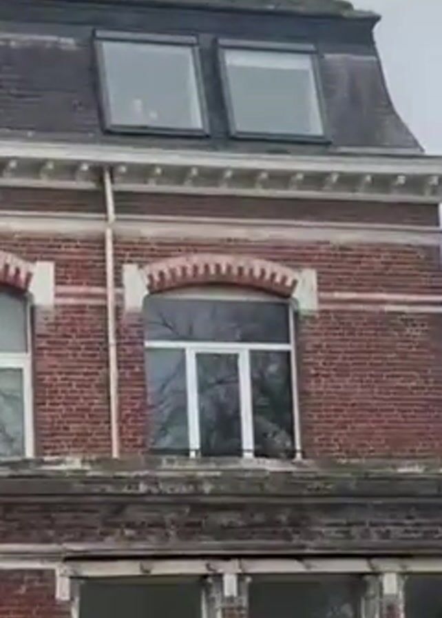 brick building on a cloudy day. There is a person visible in one of the rooftop windows, waving. The camera zooms in on the person.