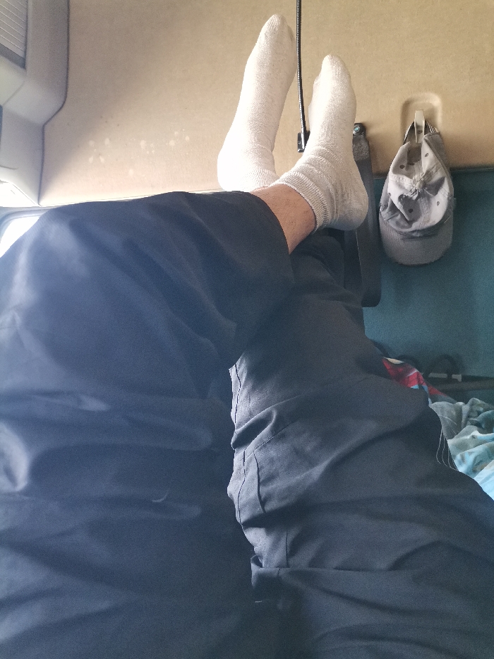 The image displays a person's lower body within a vehicle interior, located in Slanchevo, Bulgaria. The subject's legs are elevated, clad in dark trousers and white crew socks, with feet pointed upwards. The background features a light beige overhead panel. A black seatbelt strap is visible near the feet. To the right, a grey baseball cap hangs from a white plastic hook on a teal-colored wall panel. Below the elevated legs, folded textiles, including a blue blanket and another item with red and white patterns, are present on an underlying surface.