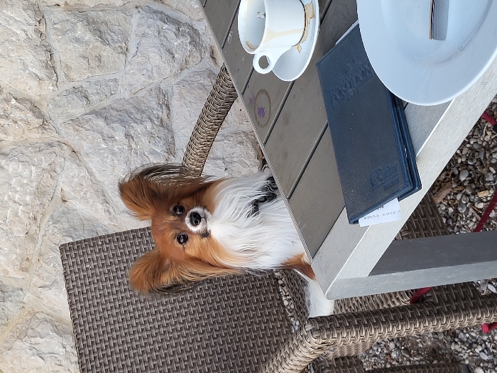 A Papillon dog, distinguished by its brown and white fur and large, fringed ears, is seated upright in a brown woven rattan-style chair. The dog faces forward and slightly right, positioned behind a grey slatted outdoor table with a silver metallic frame. On the table, from left to right, rests a dark blue check presenter embossed with "KANDON" text and containing a white paper receipt. To its right, a white ceramic coffee cup with a saucer shows residual coffee stains. A white ceramic plate with a piece of cutlery is partially visible to the far right. A faint purple mark is present on the table surface. The background features a light-colored stone wall, and the ground beneath the chair and table is composed of pebbles. The scene is located outdoors in Prijevor, Montenegro, under bright daylight.