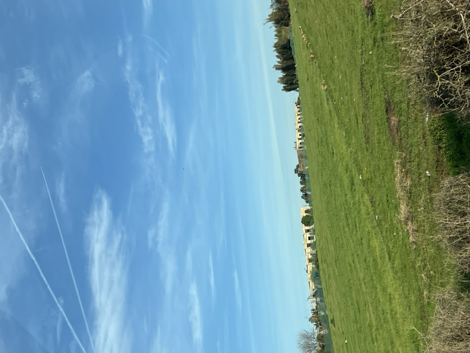 A vibrant green field dominates the right side, bordered by trees and shrubs. A row of buildings lines the edge of the field. The sky, a clear blue with wispy white clouds and contrails, occupies the left side. The horizon is a slightly tilted line separating the landscape.