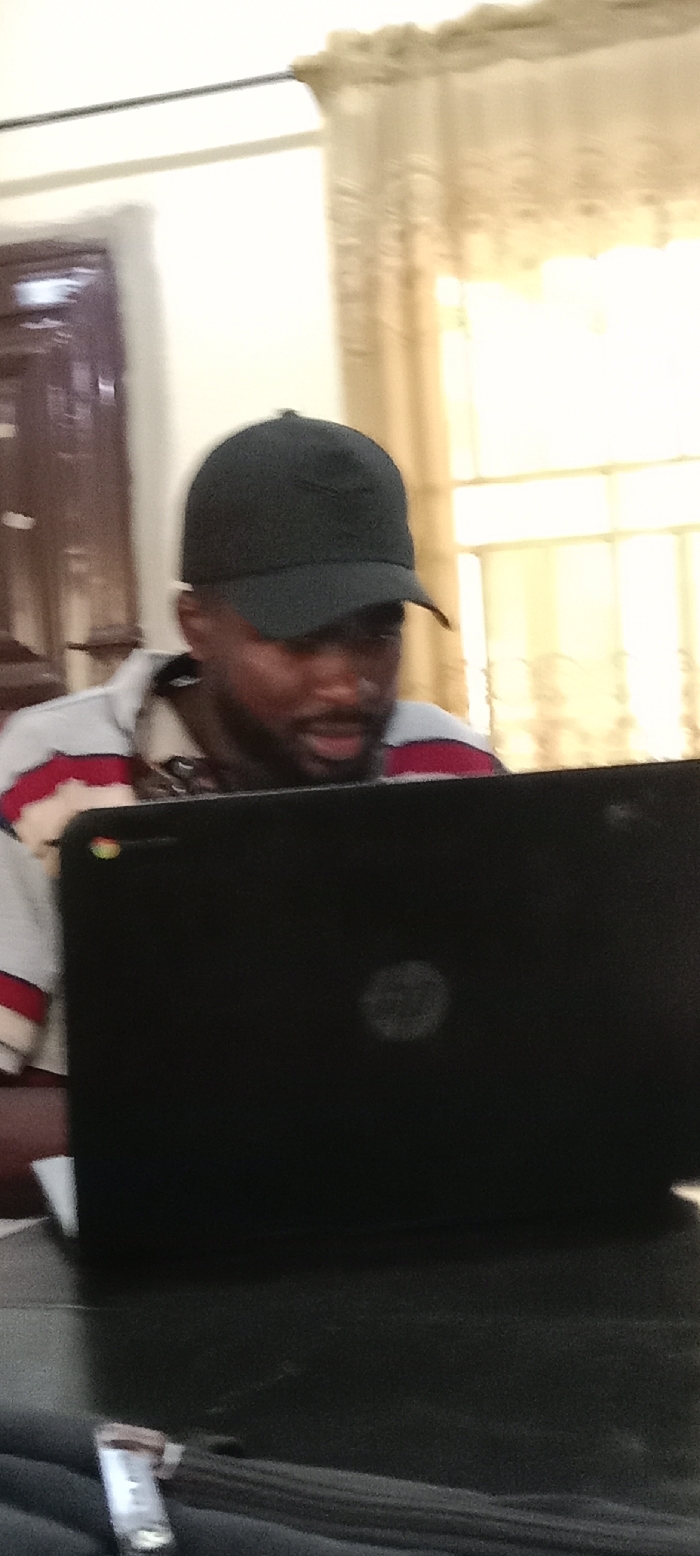 An adult male with a dark complexion and a beard, wearing a dark baseball cap with a Nike logo and a horizontally striped polo shirt (white, red, and dark blue), is seated indoors, focusing on an open black laptop. The laptop, displaying a Chrome OS sticker near the keyboard and a faint Dell logo on its lid, rests on a dark surface. The background consists of a dark-framed opening on the left and a window covered by light-colored sheer curtains on the right, admitting ambient light. This scene is located in Lokoja, Nigeria.