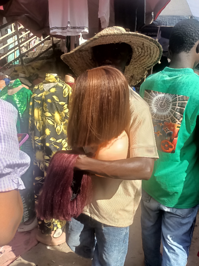 An outdoor market scene in Unguwar Kaya, Nigeria, depicts three individuals amidst a merchandise display. In the center, a dark-skinned person wearing a straw hat, a light brown collared short-sleeved shirt, and blue jeans holds a light-skinned mannequin head adorned with a brown, shoulder-length wig. Simultaneously, they hold a maroon-colored wig in their left hand, positioned below the mannequin head. To the right, another dark-skinned individual, visible from the waist up, wears a bright green short-sleeved shirt featuring a large circular graphic on the back that depicts a dome-like structure with intricate patterns and smaller graphic elements. This individual also wears blue jeans. To the far left, a third person is partially visible, wearing a light purple and white striped shirt with ruffled sleeves. The background features several mannequins displaying patterned clothing, including a green and a yellow garment. Above, a dark canopy covers the stall, from which various clothes, including white shirts with black stripes, hang. A partially visible sign in the upper right background indicates "BABY DIAPERS." The ground appears to be an unpaved surface, and the scene is brightly illuminated by sunlight.