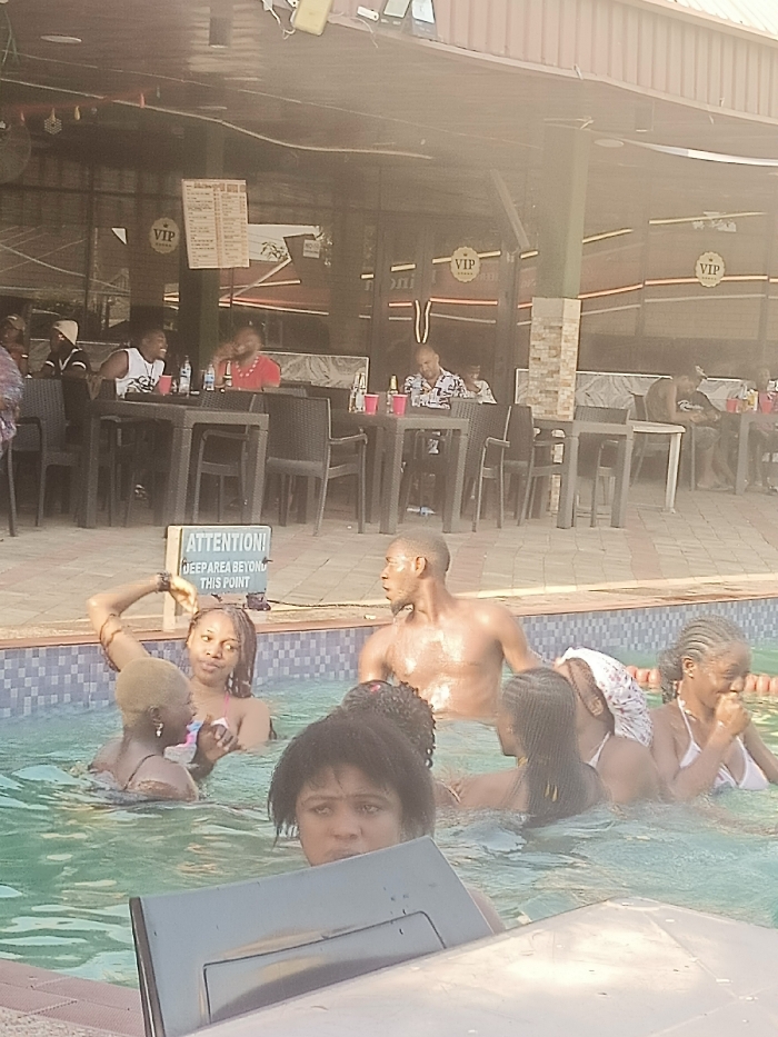 This image depicts a daytime scene at a poolside venue in Asaba, Nigeria