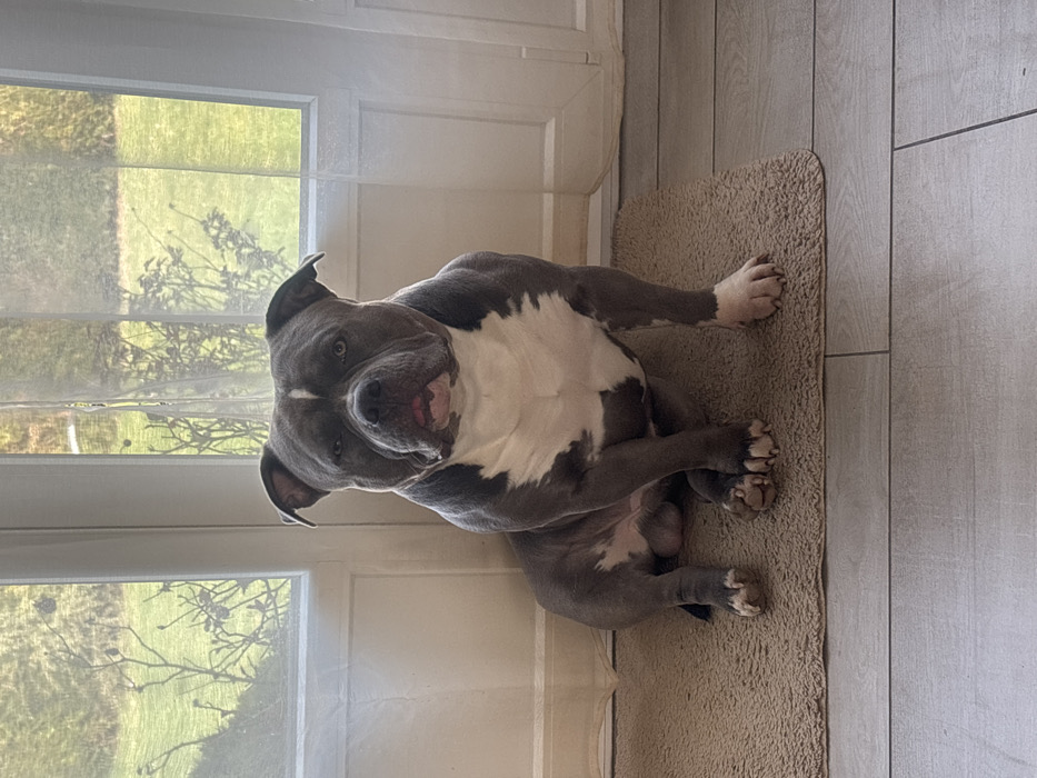 - "The image displays a blue-gray and white American Bully type dog, positioned centrally and seated on a rectangular brown mat" by FM-rEJ0w2, licensed under CC BY 4.0