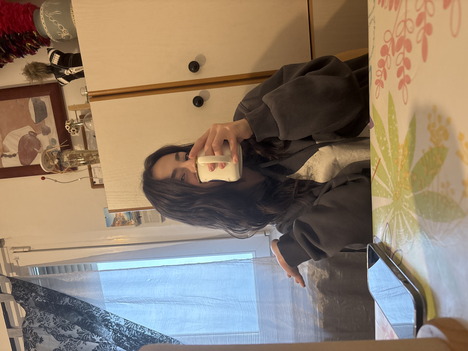 An indoor scene depicts a female subject positioned centrally, seated at a table. She has dark, wavy hair and is wearing a dark grey hooded sweatshirt with a light-colored graphic. Her right hand, featuring light pink nail polish, holds a white mug with a gold rim to her mouth, appearing to drink, while she looks towards the viewer with a slight smile. Her left hand is partially visible, resting on the table. In the immediate foreground, a dark-colored smartphone lies face-up on the table. The table is covered with a white tablecloth patterned with stylized green, pink, and yellow leaves and floral motifs. To the subject's left, a window is visible, partially obscured by a sheer white curtain and a darker, patterned curtain pulled to the side. To her right, in the background, stands a light-colored, two-door cabinet with dark circular handles. The top of the cabinet displays various decorative items: a framed painting of a figure with pottery, a clear decorative bottle, a small vase containing artificial flowers, a red textured ornament, a miniature clothing display, and a patterned vase. A small calendar or framed landscape picture is affixed to the side of the cabinet. The room is illuminated by warm interior lighting. No discernible elements within the image identify the specific location as Strasbourg, France.