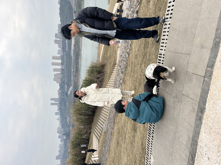 The image depicts an outdoor scene in Banan, China, on an overcast day. In the foreground, a young boy wearing a teal and black puffer jacket is seated on a paved walkway, facing away from the camera, with his back slightly turned towards two dogs. One dog is primarily black, while the other, a beagle-type dog with black, white, and tan fur, wears a colorful patterned sweater and is sniffing near the boy. To the boy's right and slightly behind him, a woman stands, facing left and slightly upwards, wearing a long white puffer coat with a fur-lined hood and patterned light-colored pants. To her right, a man stands facing slightly left, looking downwards at the dogs or the boy, wearing a dark puffer jacket over a light-colored collared shirt and dark jeans. He holds a white bottle or can in his right hand. The paved walkway features metal drainage grates running parallel to its edge. Behind the subjects, a grassy slope extends upwards, interspersed with sections of steps made of light-colored stone. Tall, dry grasses or reeds line the top of this slope. Beyond the slope, a wide river is visible, with a distant cityscape featuring numerous high-rise buildings across the water and on elevated terrain. The sky is uniformly gray and overcast. In the far left background, a lone figure in dark clothing walks up a path.