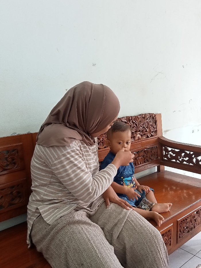 - "A woman in a brown hijab and striped shirt sits on an ornate wooden bench, cradling a young child in a blue shirt" by FM-5geVz2, licensed under CC BY 4.0