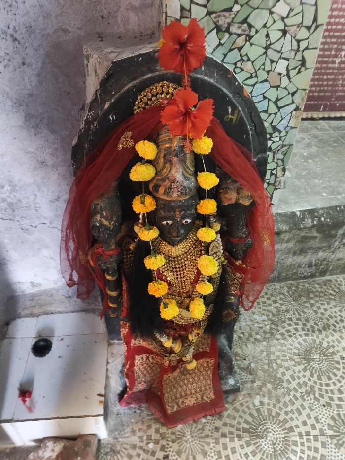 The image displays a dark-colored stone idol, identified as a Hindu deity, situated within a recessed shrine niche