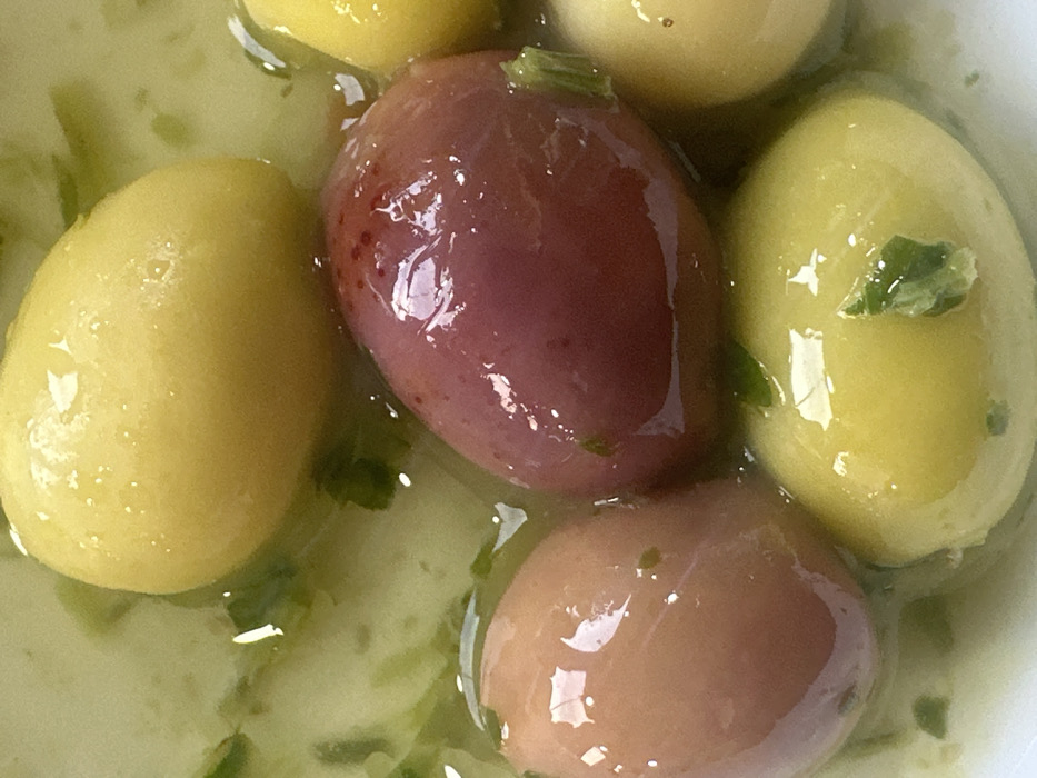 close-up of several olives in a watery marinade. There are three green olives and two darker, reddish-brown olives. Small pieces of green herbs float in the liquid. The olives appear glossy and wet, reflecting light. The overall composition is tightly cropped, focusing on the olives themselves.