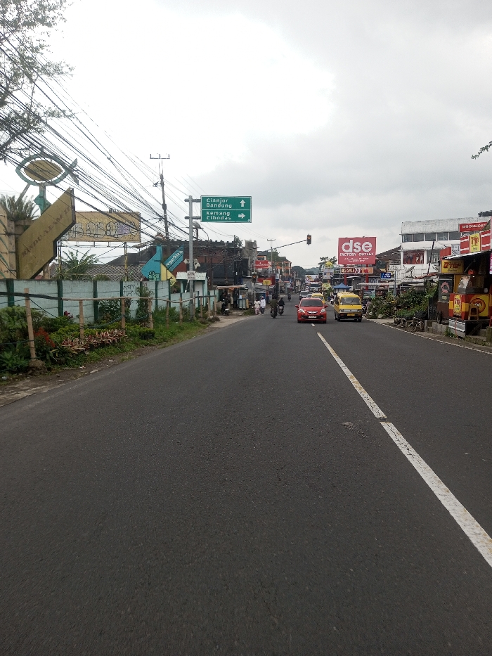 A straight road leads to a town center under a cloudy sky. Traffic includes cars and motorcycles. Buildings with advertisements line the right side of the road, while the left has a lower wall with greenery behind it. An overhead sign indicates directions to Cianjur, Bandung, Kemang, and Cibodas. Utility poles and wires are visible above.