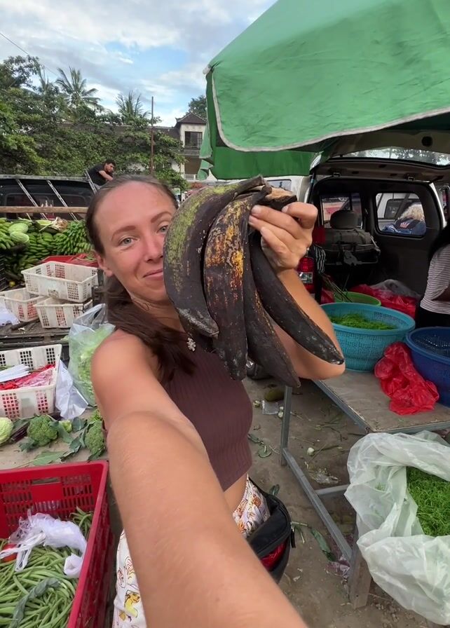 A woman holds up a bunch of black plantains in a bustling outdoor market. The woman is fair-skinned with brown hair, wearing a brown top and patterned shorts. She alternates between looking dubious and smiling at the camera. She is standing in front of a market stall overflowing with various produce, including green vegetables in baskets and crates. The market is vibrant with other vendors and shoppers in the background. A green awning is partially visible overhead. The sky is overcast. The camera angle is a first-person perspective, indicating the woman is holding the camera herself.