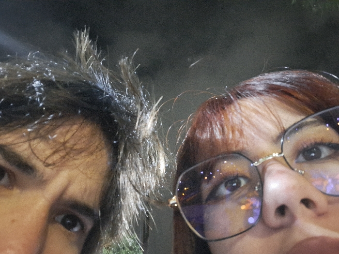 The image presents a low-angle, extreme close-up of two individuals' upper facial features. The subject on the left, identified as male, displays a partial view of the left eye, eyebrow, and forehead. His dark hair appears disheveled and is covered in numerous small, bright white particulates consistent with rain or light precipitation. The subject on the right, identified as female, displays a partial view of the right eye, nose, and forehead, with reddish-brown hair styled with bangs. She wears square-rimmed eyeglasses with black frames and gold-toned bridge and temple accents. Her eyeglass lenses reflect multiple distinct colored light sources, including orange, purple, and white. Both visible eyes of the subjects are directed forward, towards the camera. The background is uniformly dark and out of focus, indicating low-light conditions. The scene is located in San Fernando del Valle de Catamarca, Argentina.