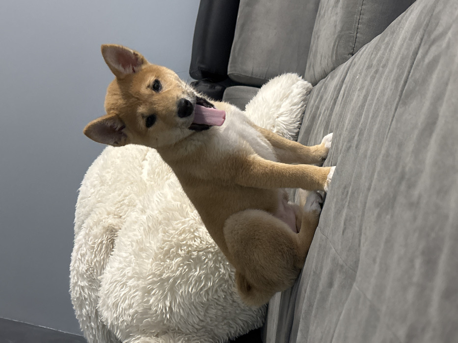 - "The image captures a small, fawn-colored dog, consistent with a Shiba Inu puppy, seated upright on a grey fabric sofa" by FM-IJRNr1, licensed under CC BY 4.0