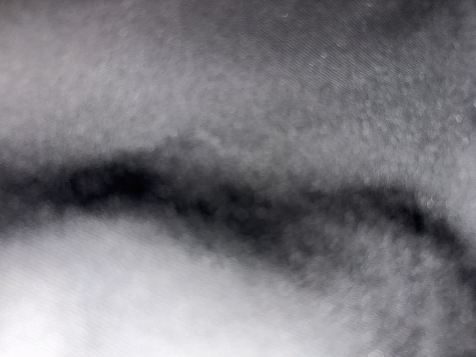 A blurry, abstract image presents a field of gray tones, punctuated by a dark, meandering line. The texture appears to be somewhat granular, creating a diffused, out-of-focus effect. The dark line weaves irregularly across the frame, contrasting with the lighter gray areas. The overall impression is atmospheric and indistinct, lacking sharp details or clear forms.