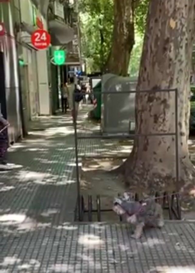 A gray and white Schnauzer-type dog is secured to a bike rack on a city sidewalk by a pink leash. The sidewalk is paved with gray square tiles, creating a grid pattern. The dog stands near the base of a large tree with mottled bark. Sunlight filters through the tree's leaves, casting shadows on the sidewalk. In the background, pedestrians walk along the sidewalk towards the distance. A woman pulls a small rolling suitcase. Storefronts are visible along the left side of the frame, including a pharmacy sign with a green cross. Trash bins can be seen further down the sidewalk on the right. The scene appears to be a typical urban street setting during the daytime.