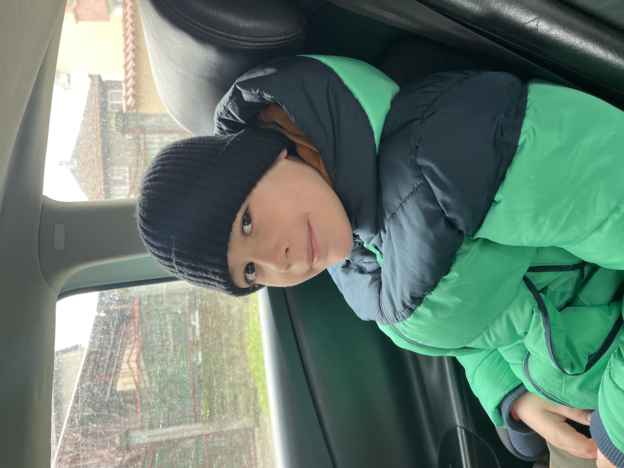 A young male child is depicted seated in the rear passenger compartment of a vehicle in Cherven Bryag, Bulgaria. The child, approximately 6-10 years old, wears a black knit beanie and a two-tone puffer jacket, predominantly green with dark blue shoulders and hood; the hood's inner lining is tan/brown. He is positioned on the right side of the vehicle's interior from the observer's perspective, facing the camera with a slight smile. His right hand is visible, resting on his lap. The vehicle's interior shows a dark gray door panel on the left and a black upholstered headrest/backrest on the right. Through the left car window, raindrops are present on the glass. The exterior environment reveals a residential area with a visible fence featuring red horizontal bars and green vertical elements, some green foliage, and multiple buildings. One building has a grey facade and a dark tiled roof, while another in the background has a brown tiled roof.