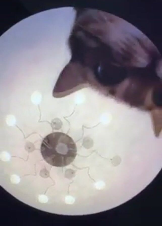 close-up, upside-down view through a peephole or similar lens. A cat's face is the primary focus, its eyes wide and appearing to look down into the lens. Behind the cat is a ceiling with a decorative light fixture containing multiple small lights arranged in a circular pattern. A catchy Latin song is playing in the background.
