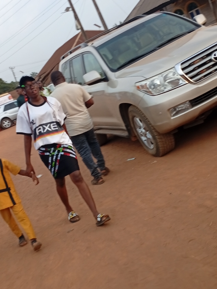 A beige Toyota Land Cruiser dominates the frame on a reddish dirt road. A person in a white t-shirt with "AXE" printed on it and a patterned skirt walks in front of the vehicle. Behind them, another individual in a tan shirt and jeans stands beside the car. A child in a yellow outfit partially enters the frame from the left. Overhead wires and a portion of a building are visible in the background.