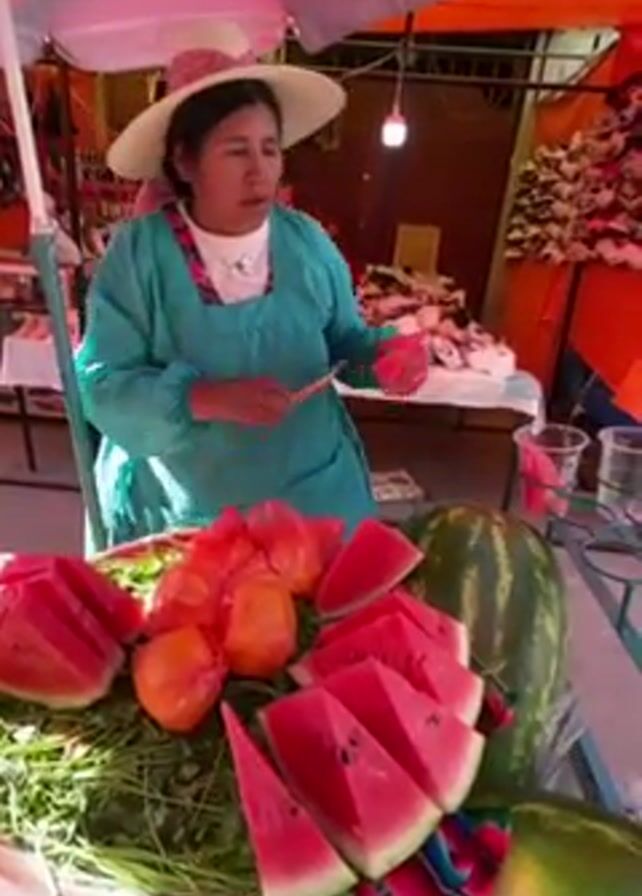 woman in a market, likely in South America given her traditional dress, cutting watermelon and packaging it into small plastic bags