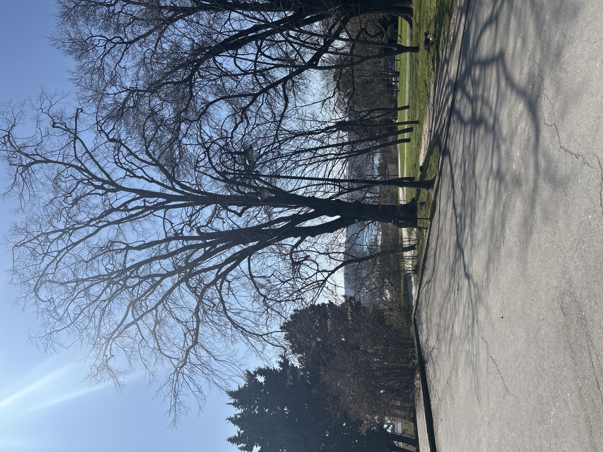 The image depicts an outdoor park scene, specifically within the Sea Garden (Morska Gradina) in Varna, Bulgaria, during a clear, sunny day. The foreground features a grey, cracked asphalt or concrete path, across which long, distinct shadows from numerous bare deciduous trees are cast. To the left, evergreen coniferous trees and dense, leafless shrubs are visible. A large, prominent deciduous tree with intricate bare branches stands centrally, dominating the midground. Further into the midground, a landscaped grassy area with visible pathways winds through additional bare trees, some equipped with streetlights. Beyond the trees and parkland, a view of the Black Sea is discernible under a light blue sky. The sky also exhibits a sun flare in the upper left quadrant. No individuals or animals are present within the frame. The scene suggests late winter or early spring, given the lack of foliage on most trees.