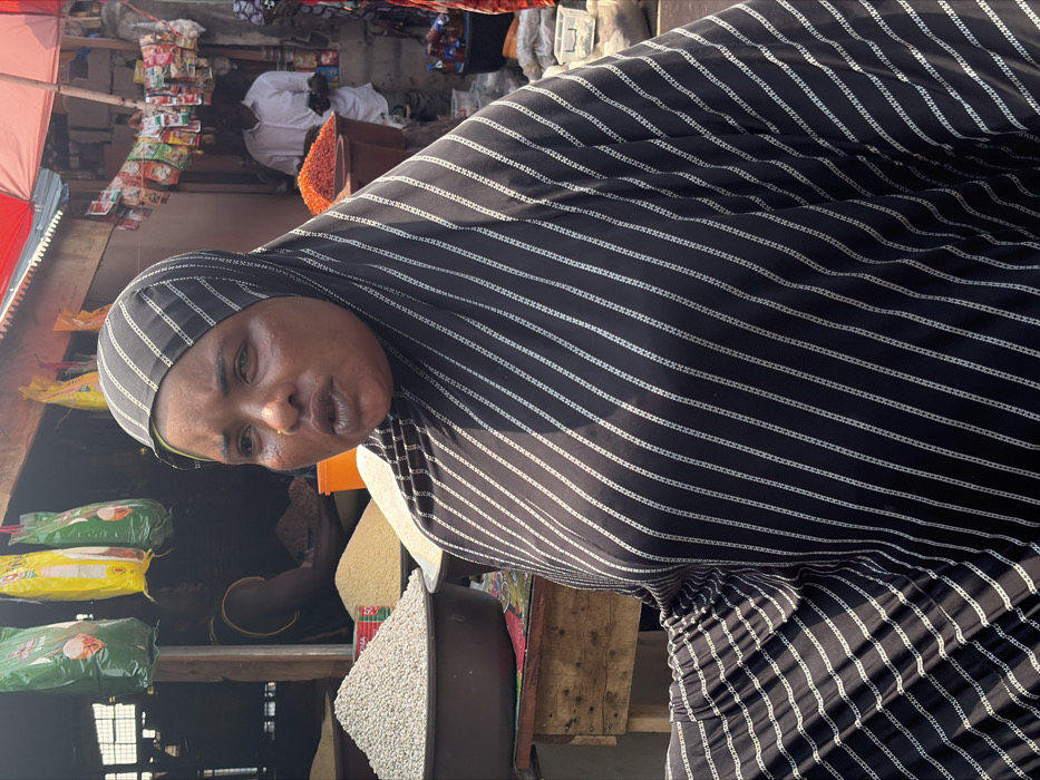 In Jakande, Nigeria, a medium-shot image captures a market scene centered on a woman of African descent, facing slightly left with her lips parted, suggesting speech. She wears a black hijab featuring thin, diagonal white striped patterns, and a light-colored nose ring in her left nostril. To her left, large, dark basins on a wooden table hold various dry grains, including white and yellowish varieties. In the background, behind these grains, a person in a dark top is partially visible within a shaded stall. Overhead, green and yellow bags containing goods hang. To the woman's right, a distinct market stall displays a large mound of red items, possibly dried peppers, in a container. A man in a white shirt stands further back within this second stall, above which packaged goods are strung, and a red and white striped awning provides overhead cover. The scene is brightly lit by natural light, indicating an outdoor or open-air market environment.