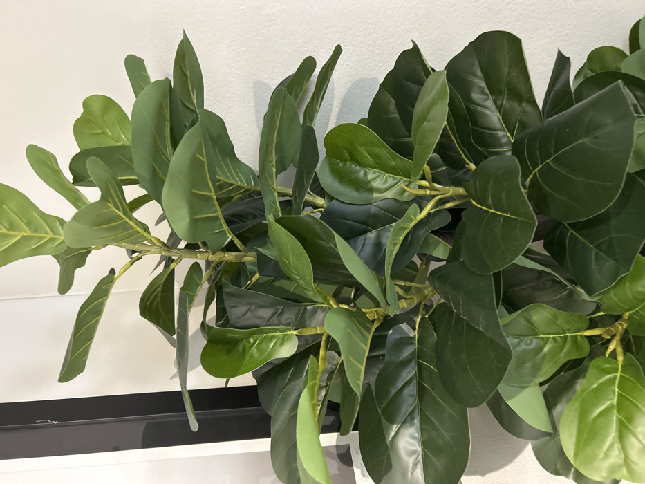 A close-up shows a flourishing arrangement of artificial fiddle-leaf fig branches