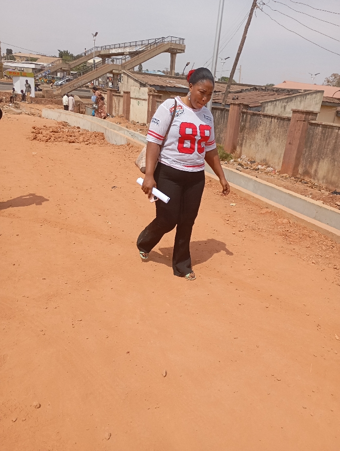This image depicts an outdoor urban scene in Jos, Nigeria, specifically identifiable by the prominent multi-ramp concrete pedestrian overpass, which is characteristic of major thoroughfares like Murtala Mohammed Way, near the Terminus Market area. In the foreground, an unpaved, reddish-brown dirt path extends across the frame. An adult female is the primary subject, captured mid-stride, walking from the right side of the frame towards the left, with her head turned slightly towards the camera. She has dark hair pulled back, possibly with a red accessory. She wears a white, short-sleeved jersey-style top with red stripes on the sleeves and a large red "88" and "CFC" text on the front. Her attire includes black flared trousers and light-colored sandals. A light-colored shoulder bag hangs on her left side, and she holds a rolled-up white document or paper in her left hand. The mid-ground features ongoing civil works: concrete curbs or drainage channels line the dirt path, accompanied by piles of reddish-brown loose earth. Beyond this, a paved road is visible with approximately 5-7 individuals, including some standing and others walking near the base of the large grey concrete pedestrian overpass. This overpass features multiple sets of stairs and ramps, along with metal railings, ascending towards a central platform. A white sign reading "POS C" is visible to the left of the bridge's base. In the background, various urban structures are present, including single and multi-story buildings with concrete walls and corrugated metal roofs. Utility poles with overhead wires and streetlights are also visible. The sky is a light, somewhat hazy blue, indicating bright daylight conditions.