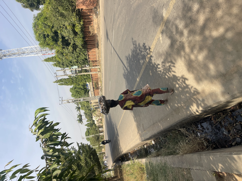 This image depicts a daytime street scene in Hanwa, Nigeria. In the foreground, a large leafy branch extends from the upper left. A concrete path runs parallel to an asphalt road on the left side of the frame. Adjacent to the path is an open concrete-lined drainage ditch containing water, dry vegetation, and debris. A single person, viewed from behind, is walking forward on the concrete path, moving away from the camera. This individual wears a long-sleeved, patterned garment in shades of maroon, yellow, and teal, with matching trousers, and light-colored footwear. A circular, flat object, possibly a tray or basket, laden with numerous light-colored items, is balanced on their head. Their shadow extends across the path and partially onto the road. The asphalt road, marked with a yellow dividing line, occupies the center and right portions of the image. Tree shadows are cast prominently across the road surface. In the mid-distance on the road, a person riding a motorcycle is visible, along with other indistinct vehicles or figures. The background features multiple utility poles with overhead power lines. Various trees with green foliage are present, including tall, narrow evergreens and broader deciduous trees. Behind these trees, on the right, a low brick wall is visible. A tall, white lattice telecommunications tower stands prominently in the far right background against a clear, light blue sky. The scene is illuminated by strong natural sunlight, producing distinct shadows.