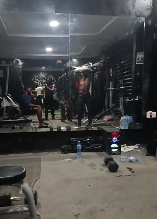 gym with several people, including one man who takes off his shirt and poses in front of a mirror. Others are sitting and standing around, and there are weights and workout equipment visible. A sound system is playing music.