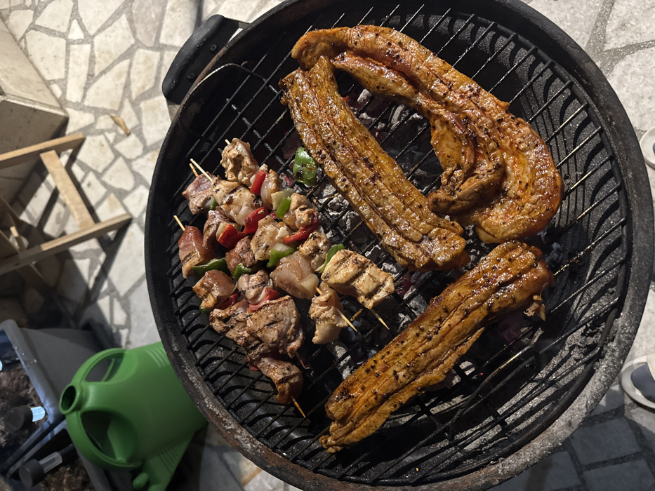 The image displays a circular charcoal barbecue grill in an outdoor setting in Sofia, Bulgaria