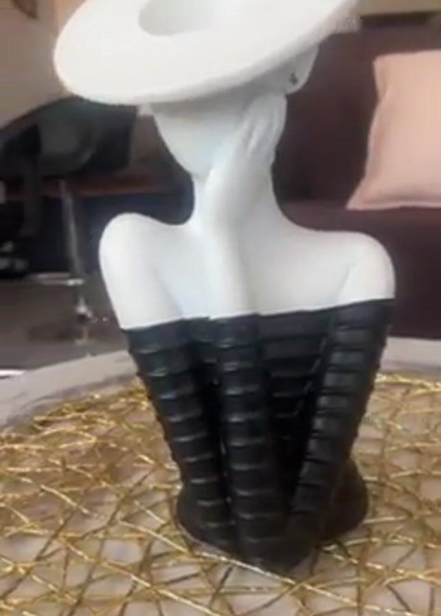 A decorative ceramic sculpture of a woman with a white hat and a black corset on a gold placemat. The background is a living room with a brown couch, black chair, and framed artwork on the wall. The sculpture is the main focus of the video and is positioned in the center of the shot.