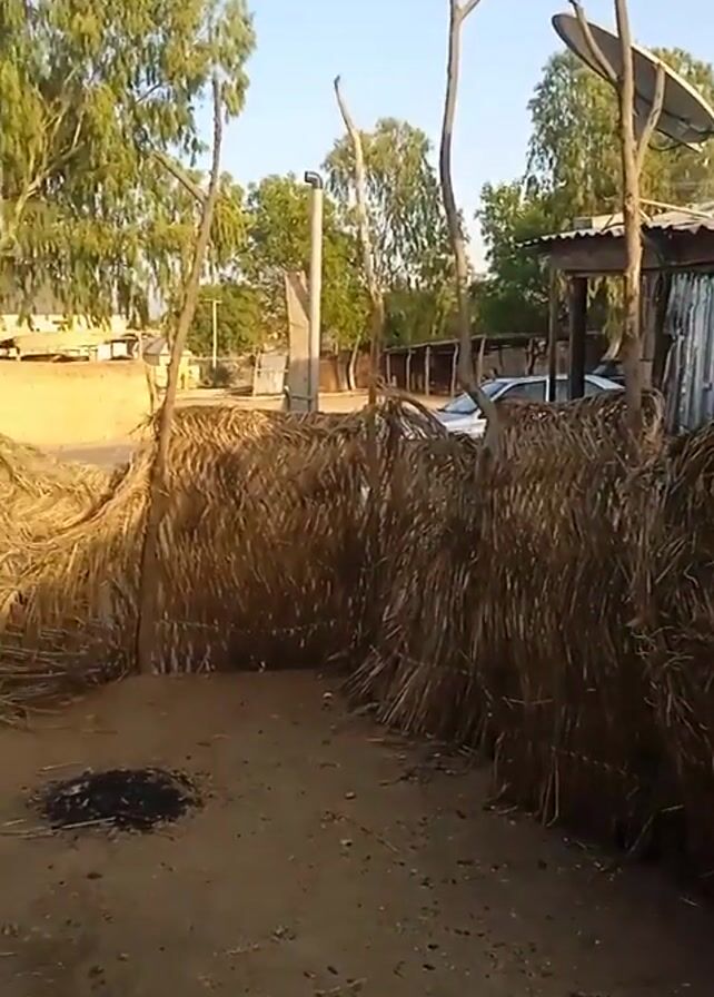 sunlit outdoor scene, likely in a rural or semi-rural area. The camera pans across a fenced area made of dried grasses or hay. There are wooden posts supporting the fencing. A small pile of burnt material sits on the sandy ground inside the fence. To the left of the frame, a large black plastic water tank sits atop a concrete block structure. In the background, there are trees, buildings, a car, a satellite dish, and a distant hill or mountain range. The sky is clear and blue.