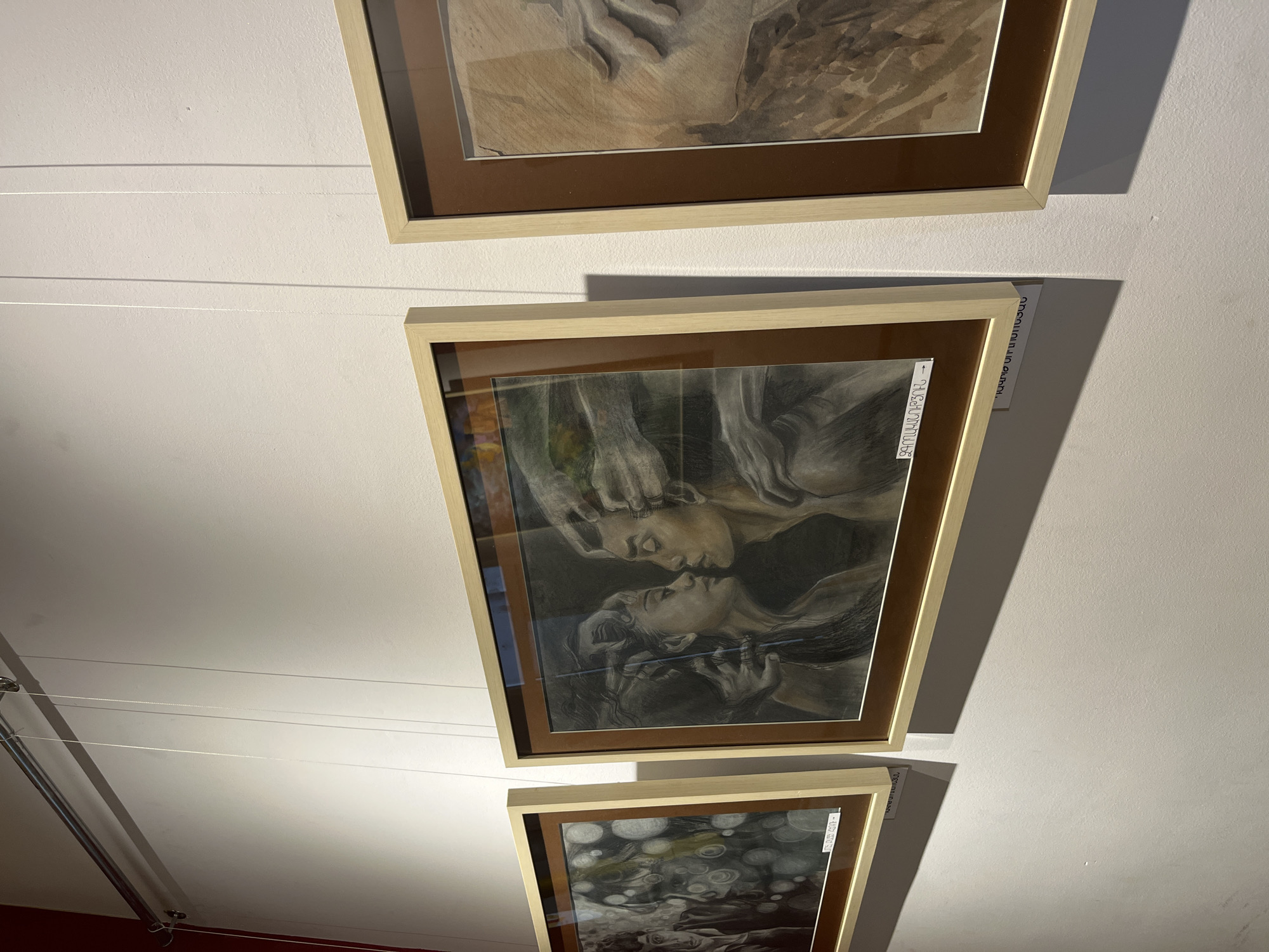 A low-angle shot shows three framed pictures hanging on a white wall. The top picture has a beige frame, and the artwork appears to be a light brown abstract scene. The middle picture also has a beige frame and contains a monochrome drawing of two people, possibly kissing, with hands overlapping. The bottom picture, also framed in beige, features a monochrome depiction of a surface with circular elements. The pictures are hung with thin wires attached to a rail. A glimpse of a red floor is visible at the bottom left corner of the image. The presence of artwork suggests this is an art gallery or exhibition setting in Yerevan, Armenia.