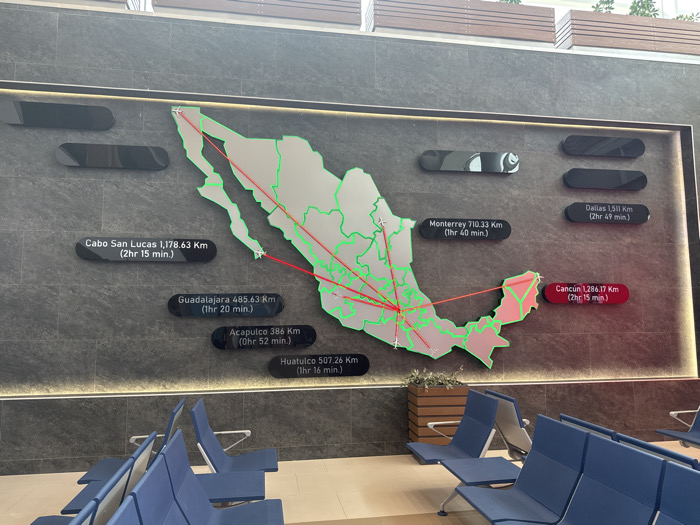A wall map of Mexico displays distances and flight times to various destinations from a central location, likely Mexico City. Cabo San Lucas is 1,178.63 km (2hr 15 min), Guadalajara is 485.63 km (1hr 20 min), Acapulco is 386 km (0hr 52 min), Huatulco is 507.26 km (1hr 16 min), Dallas is 1,511 km (2hr 49 min), Monterrey is 710.33 km (1hr 40 min), and Cancún is 1,286.17 km (2hr 15 min). Red lines connect the central point to each destination on the map. The map is situated in an airport waiting area with blue seating.
