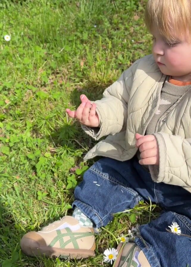 A small child with blond hair is sitting on a patch of green grass dotted with small white daisies. The child is wearing blue jeans, a beige padded jacket, and tan-colored shoes with green markings. The child is intently examining a small white daisy in their hands, moving it between their fingers. The background is filled with more grass and a few yellow flowers. The scene is well-lit by sunlight.