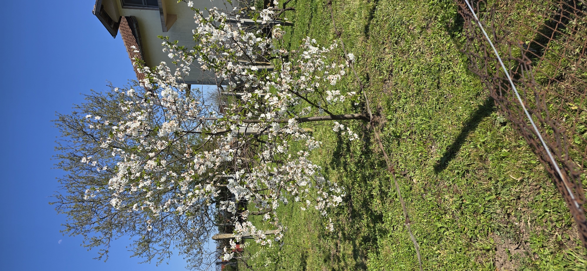 A landscape photograph depicts a blooming fruit tree in Yasna Polyana, Bulgaria, with a house visible in the background. The sky is clear and blue, contrasting with the white blossoms of the tree. The tree's branches extend widely, showcasing the profusion of flowers. Green grass covers the ground, suggesting a lawn or meadow setting. A section of a rusty chain-link fence is on the right, with a line of white wire running along the top. The shadow of the tree is visible on the grass.