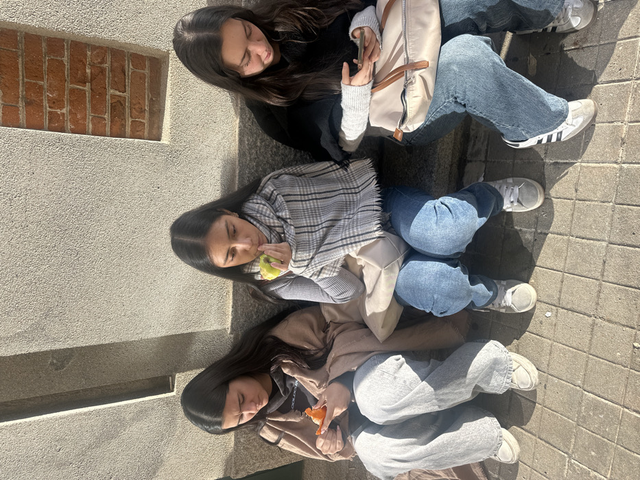 - "Three young women are seated side-by-side on a dark stone ledge or bench against a building wall on a paved sidewalk in Madrid, Spain, under direct sunlight" by FM-1e4ny2, licensed under CC BY 4.0